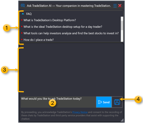 The Save button lets you store a conversation or response for future reference, so you can easily revisit important information later. Saved history will be available at "C:\Users\<USER>\AppData\Local\TradeStation Technologies\TradeStation\10.0\Logs"
