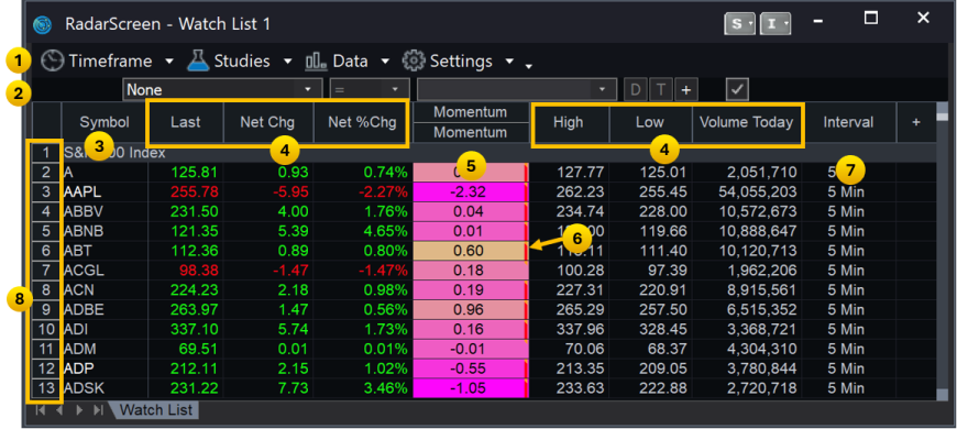 Interval column - The interval column displays the bar interval used for historical indicator columns. To change the interval for one or more rows, right-click on one or more symbols and select Timeframe. This feature is exclusive to RadarScreen.