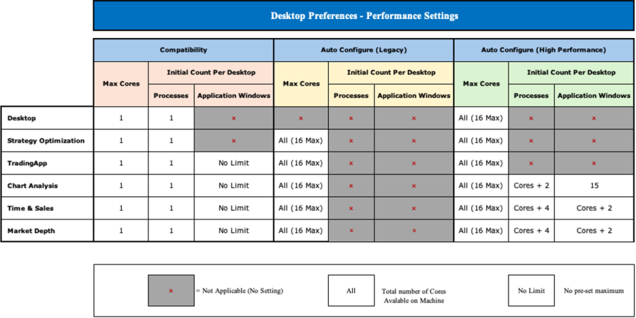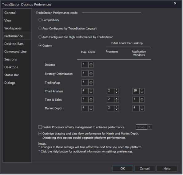 - Auto Configured by TradeStation (Legacy) - When this setting is selected, the Desktop - Max. Cores setting is set to 1 (one). All of the other settings are automatically set (up to a maximum of 16) based on the number of cores on the computer's CPU.